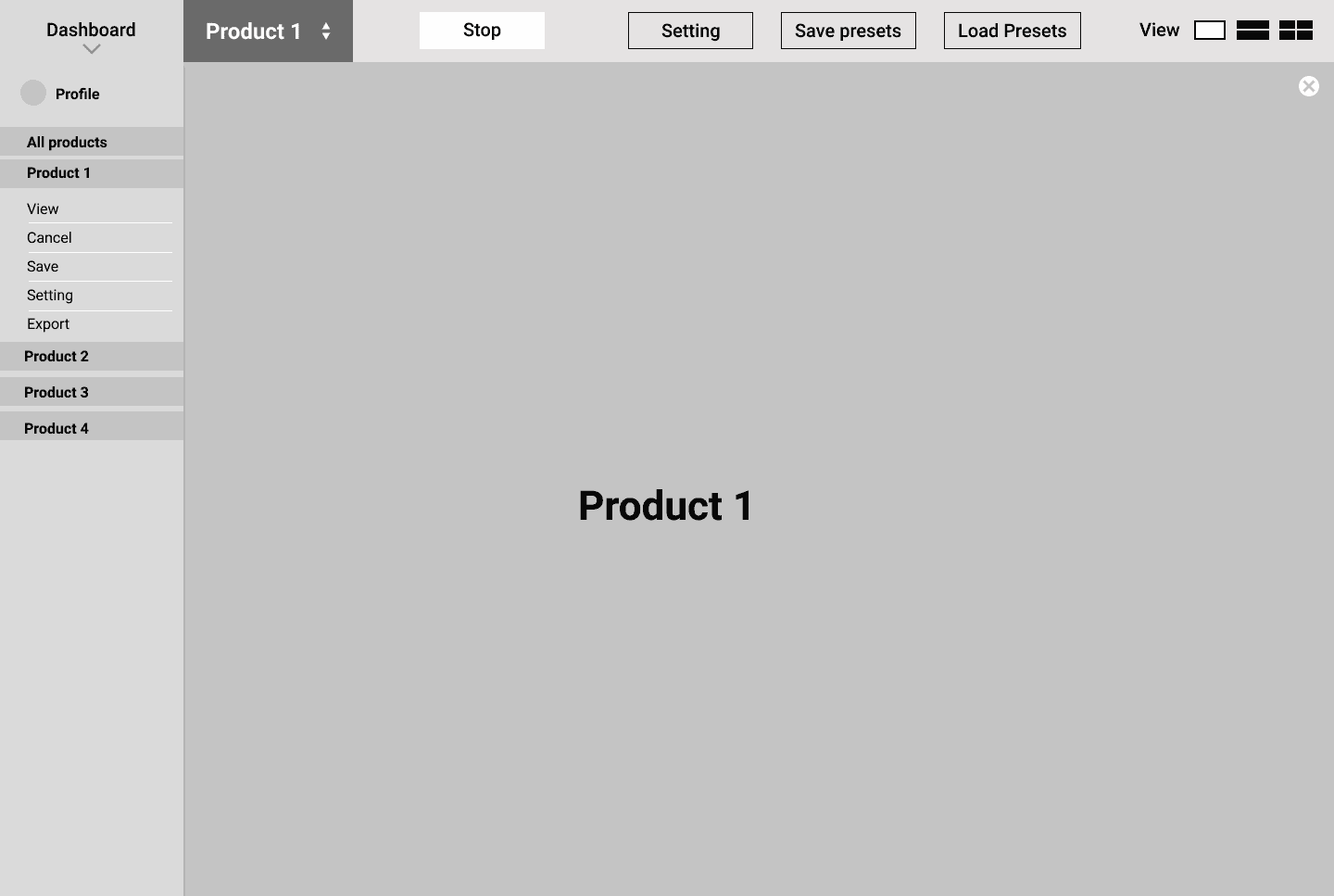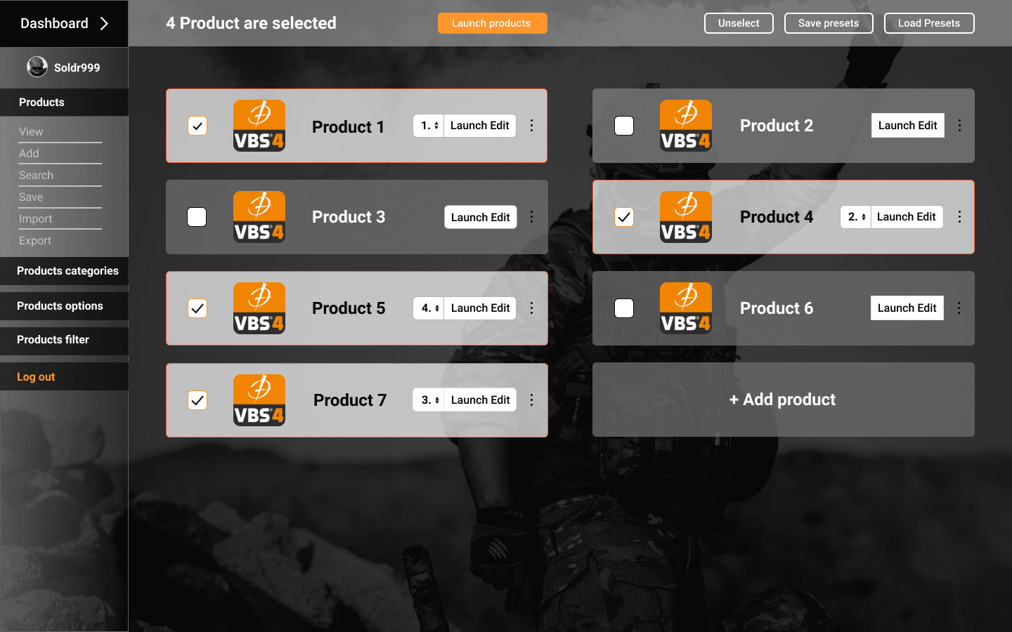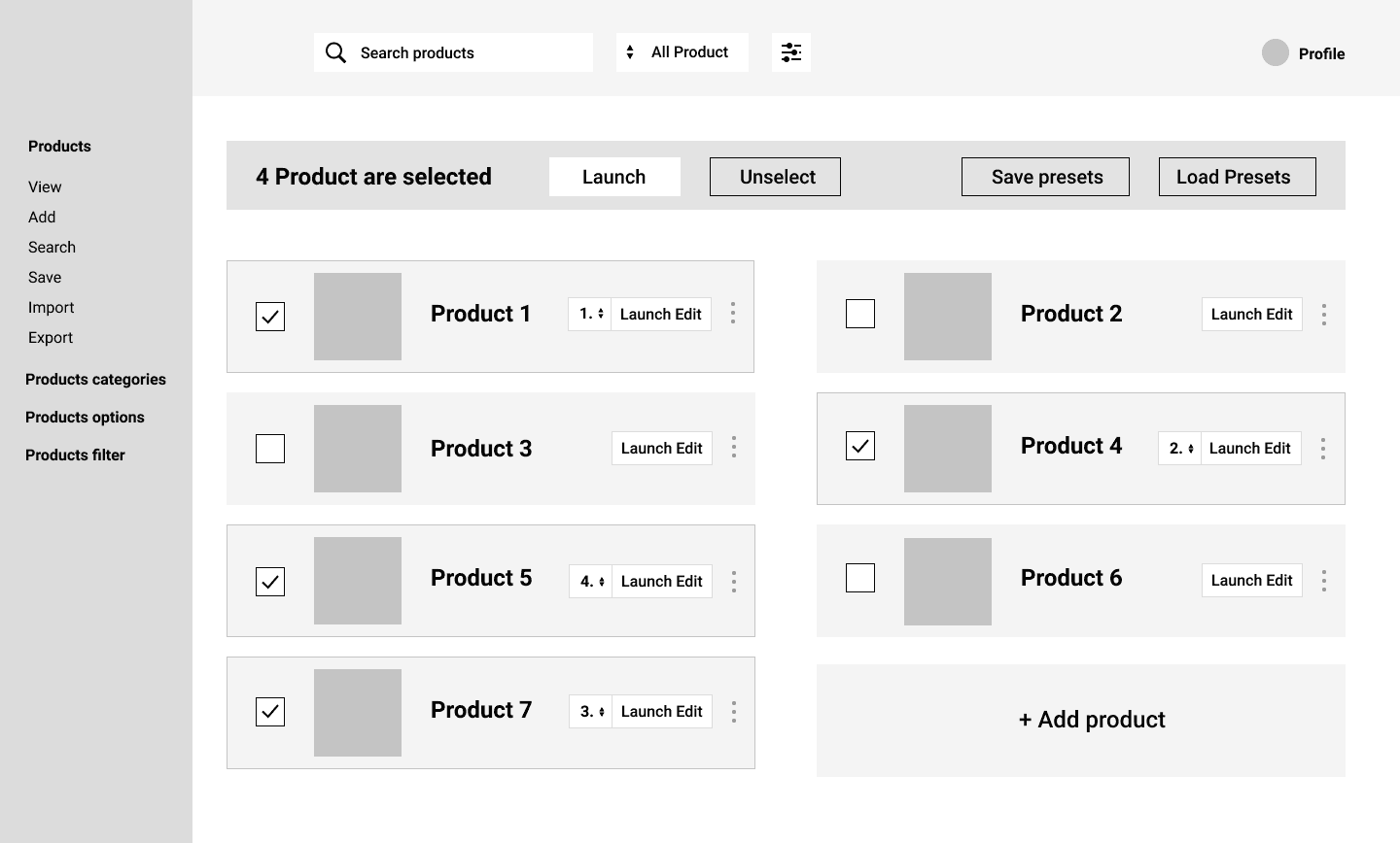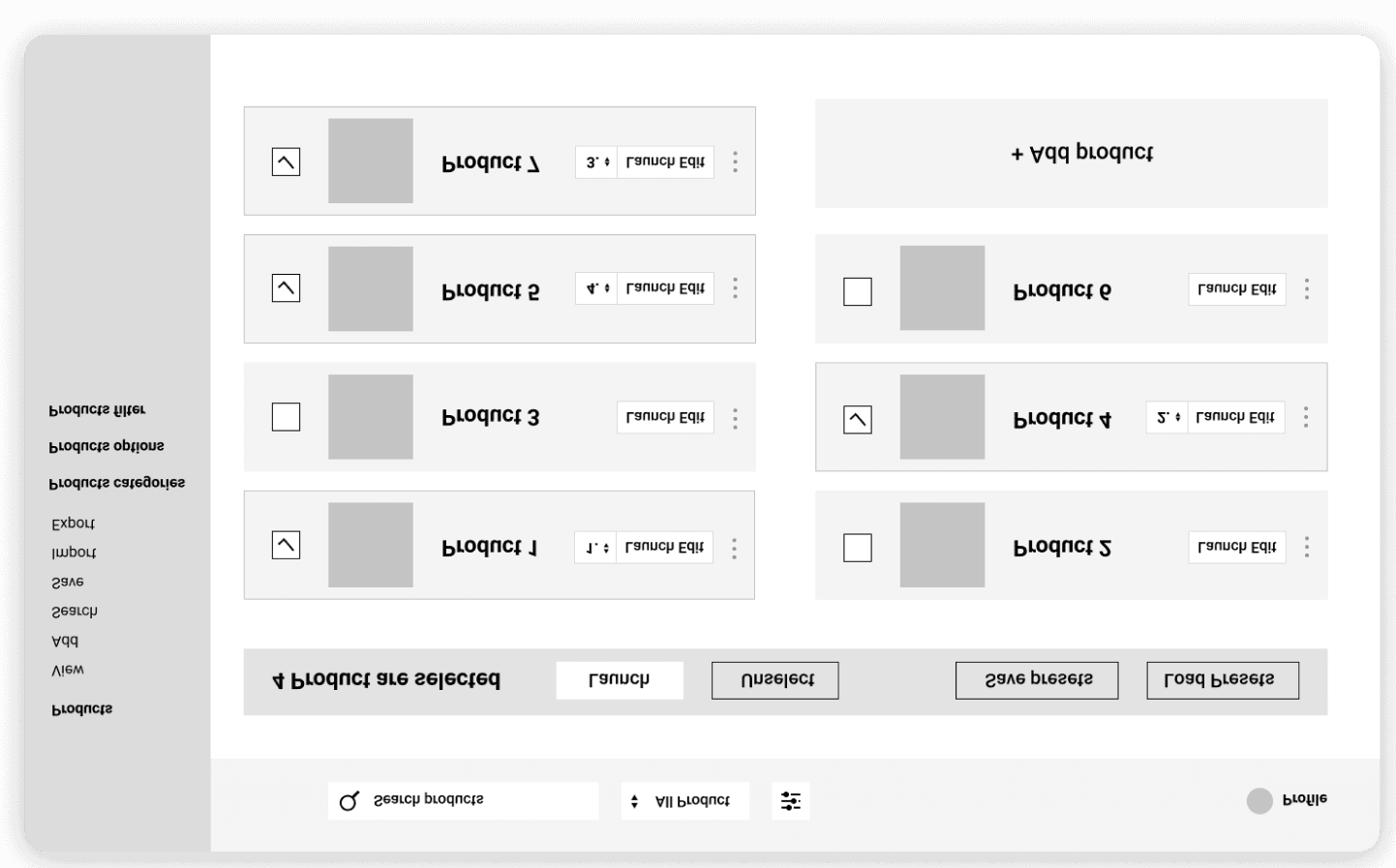 Dashboard, or the main task of this exercise. In this part, I should include the products that the user chooses, edits, and adds to the queue in the selected order. The user selects each product separately and chooses the order in which to launch them. The best way to do this, in my opinion, is by using checkboxes and allowing the order to be changed with a drop-down menu. After selecting the product(s), the options for launching the product, saving it, or uploading already saved products with configurations will appear at the top of the navigation.