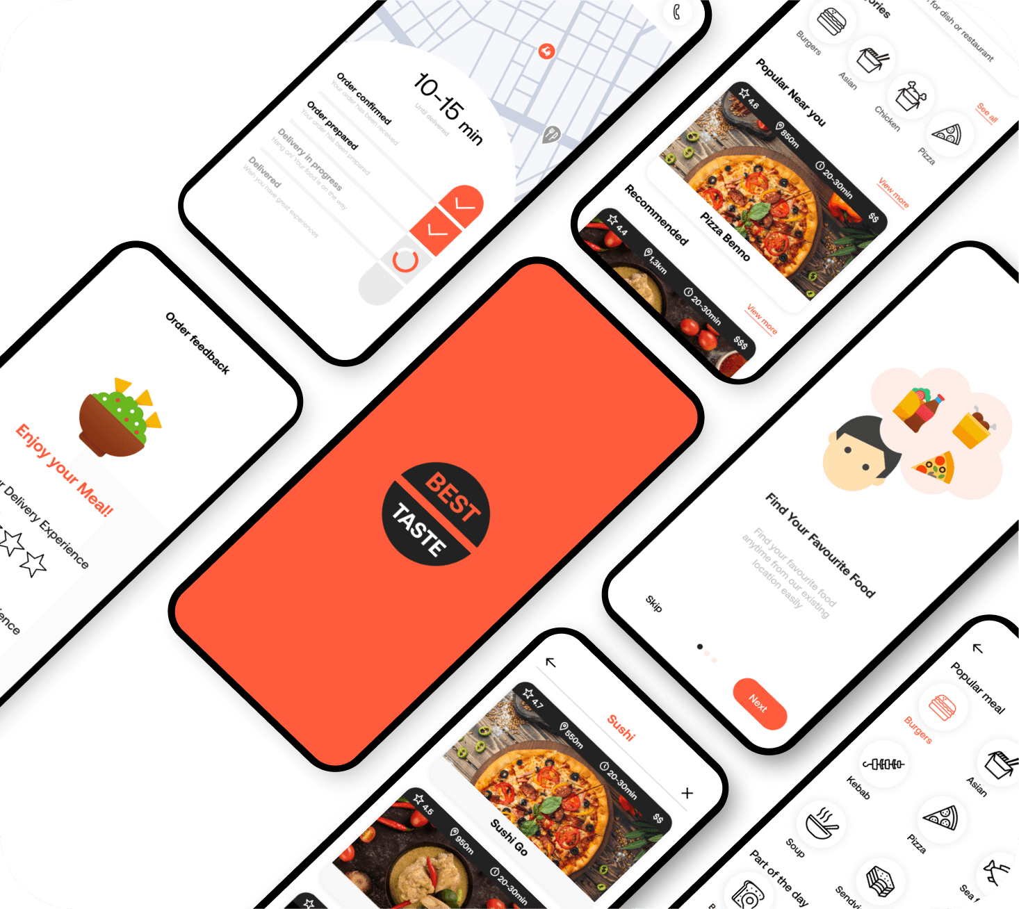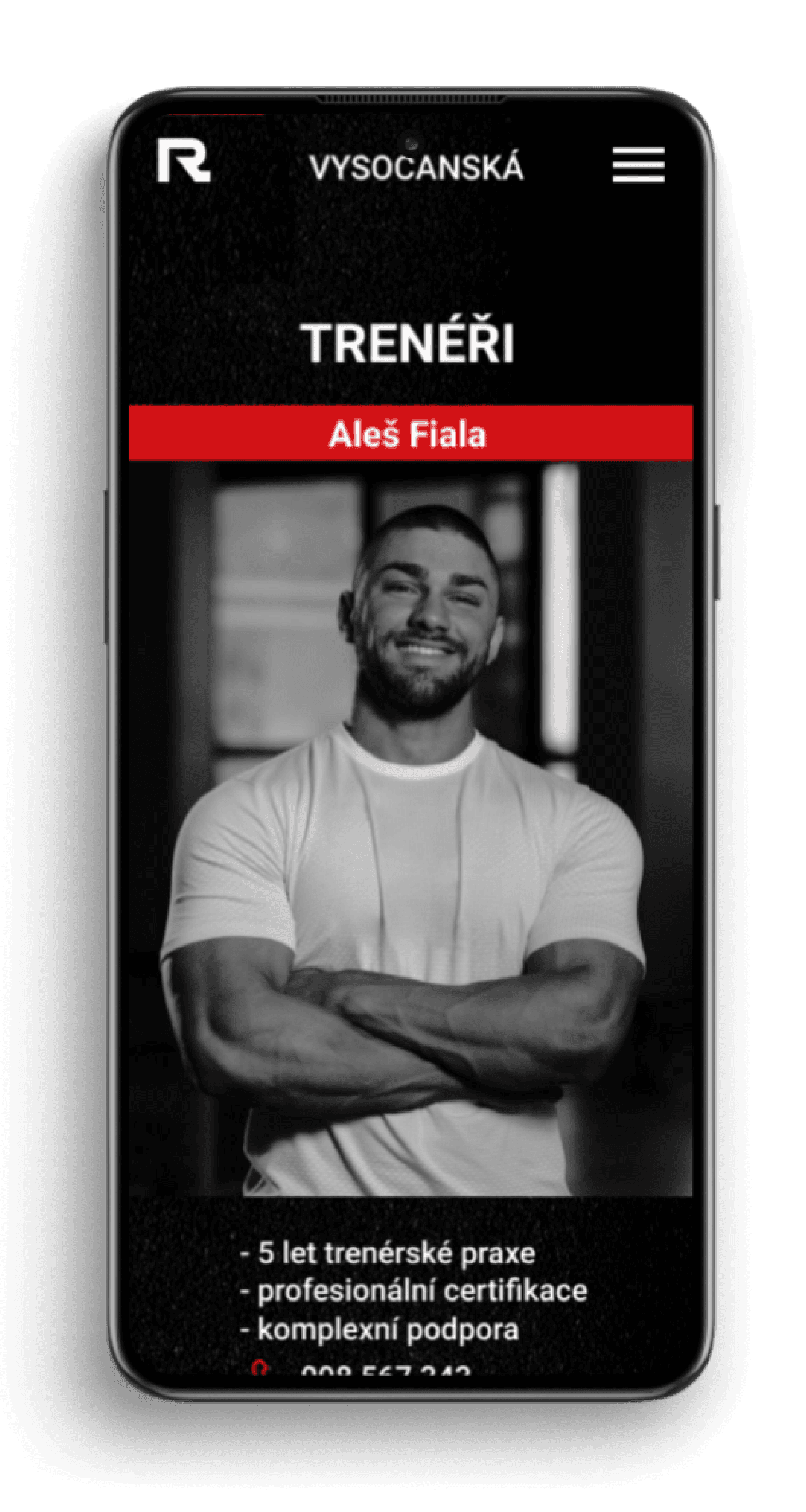 Minimalist version of the mobile app, showcasing pages such as trainers, contact, expanded menu, and more.