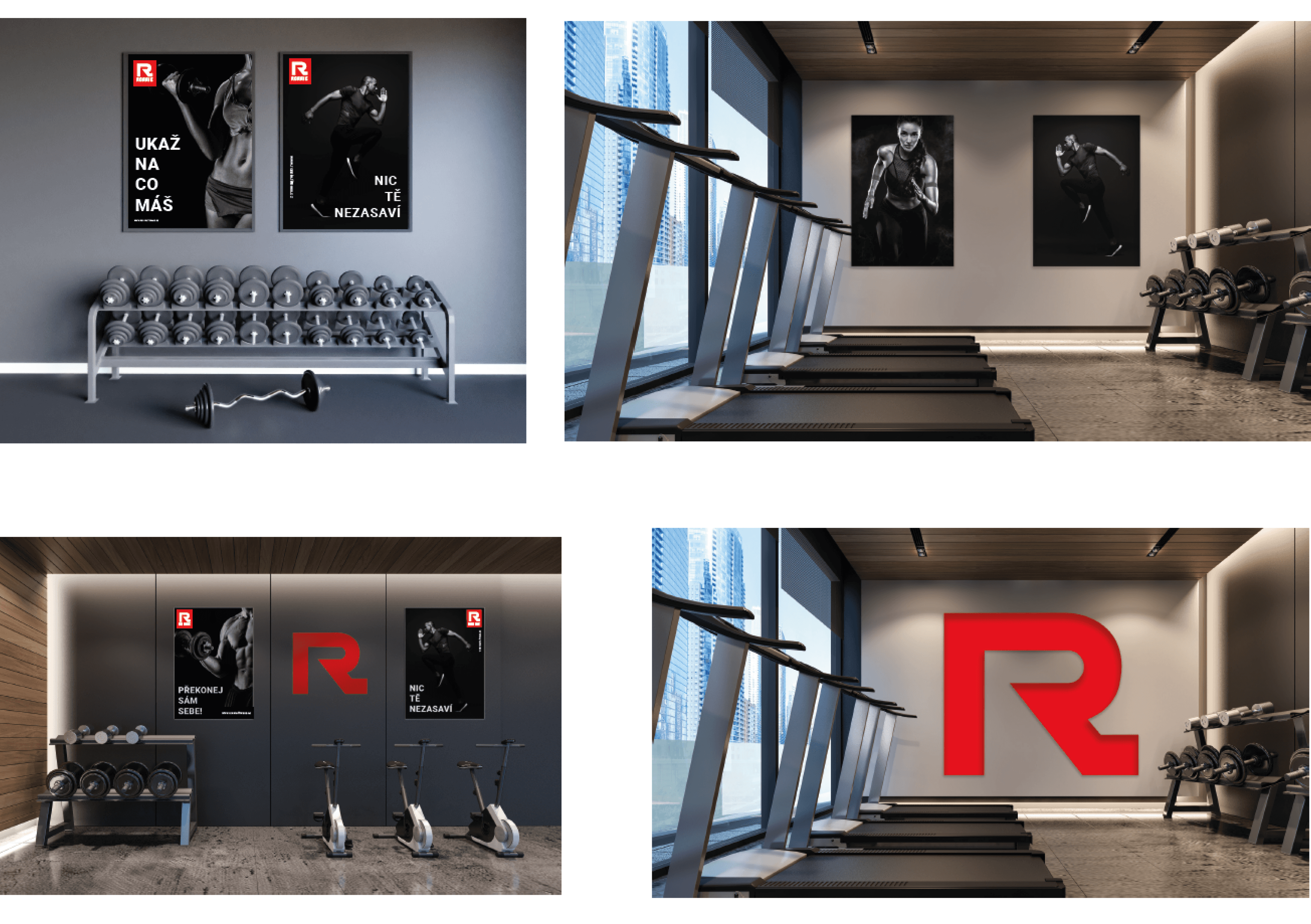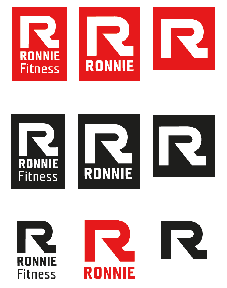 Here are a few variants and color combinations for my new logo redesign. I chose a minimalist typography style that allows the logo to be used with or without the gym's name. The red color can be used alone or in combination with black. The symbol was a modified letter 'R,' and the font used for the text is 'Teuton.'