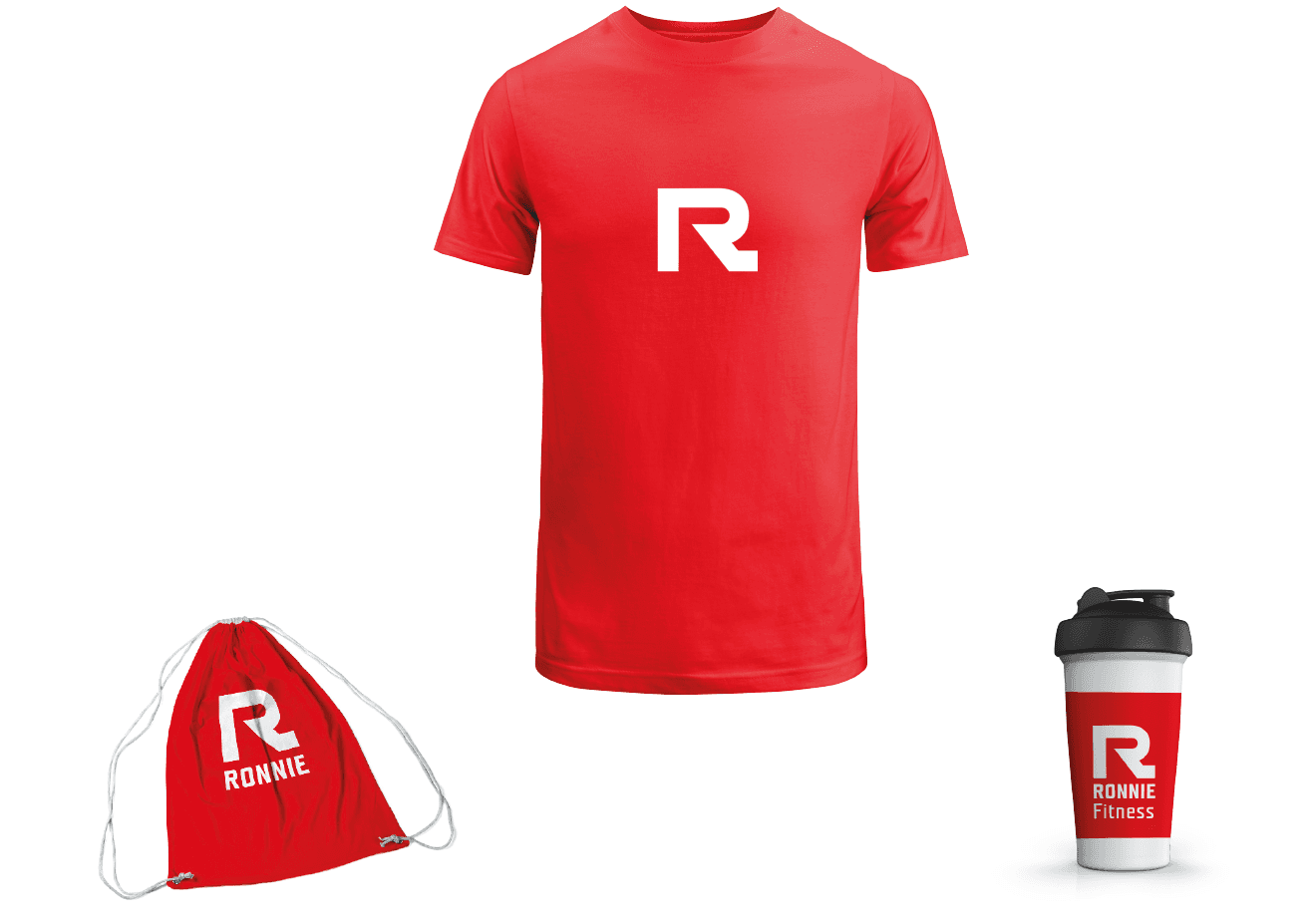 Here is the second part of the gym's visual identity, including photos, other graphic elements, and the logo on merchandise.
